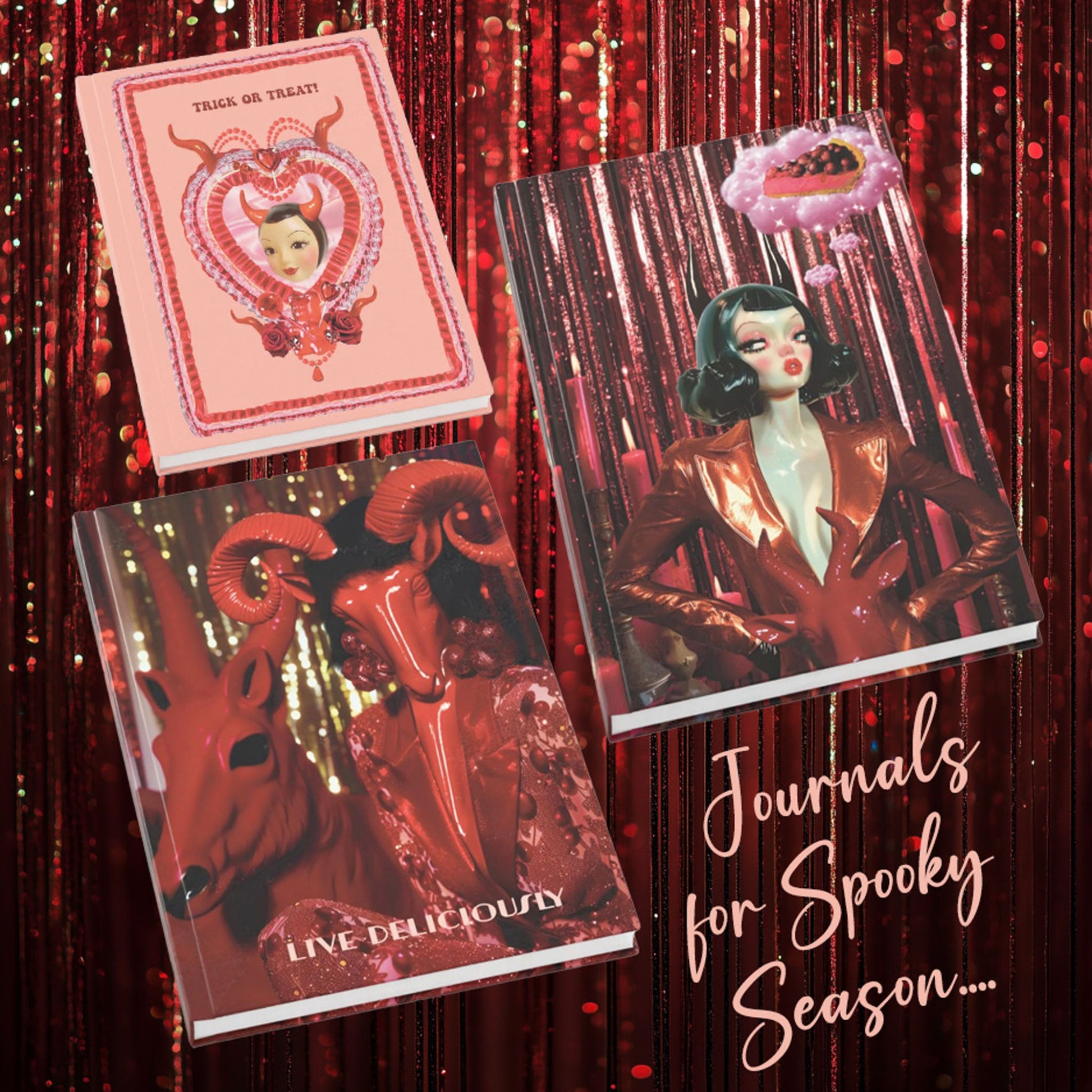 A chintzy, vintage-cute devilette fantasy of pinks, reds, and candy-coated mischief. Perfect for jotting secrets, schemes, and seasonal spells.