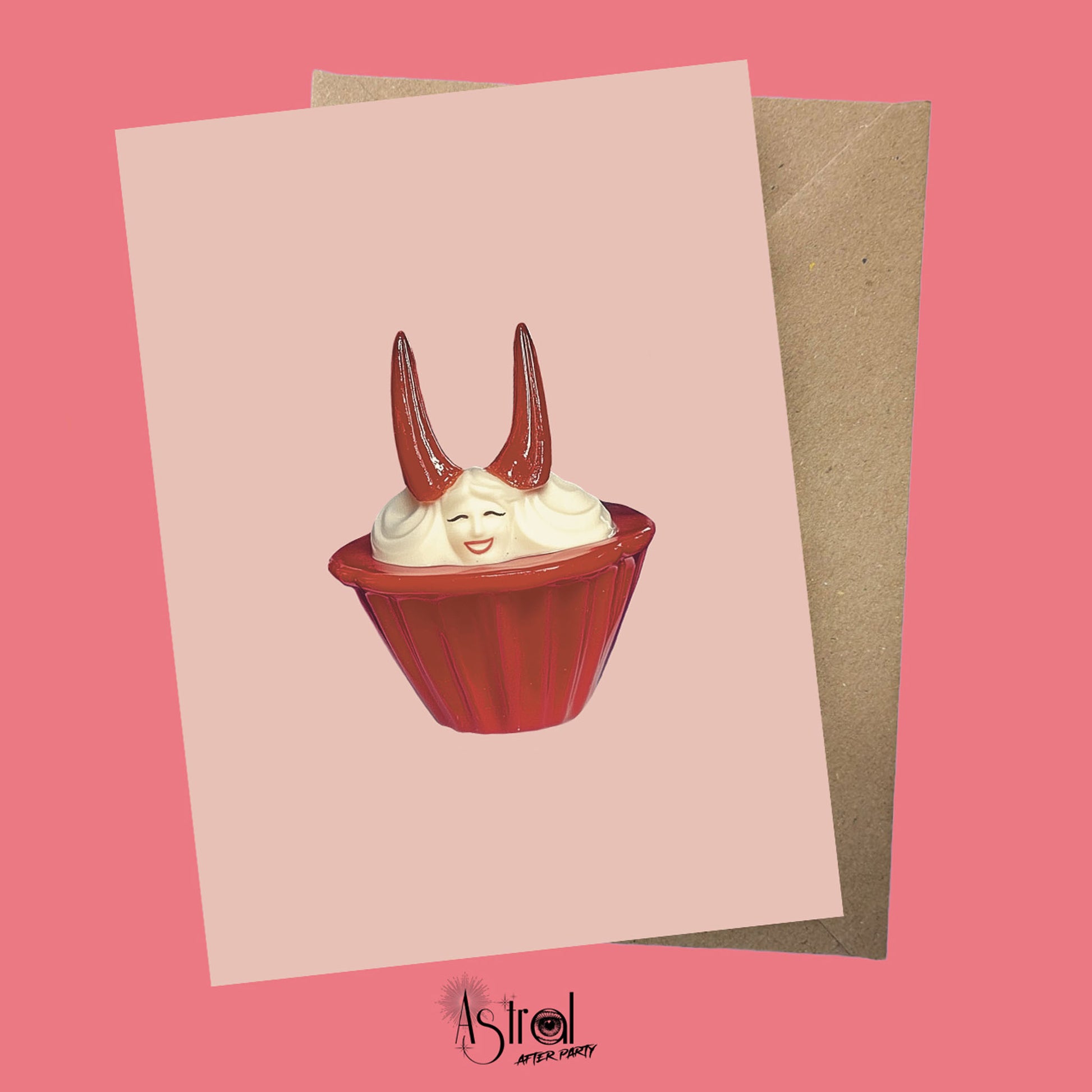 Let your favourite 'lil devilette know you're thinking of them with this chintzy, creepy-cute greetings card measuring 7 x 5 inches on 280 gsm gloss coated card, with a Kraft envelope.